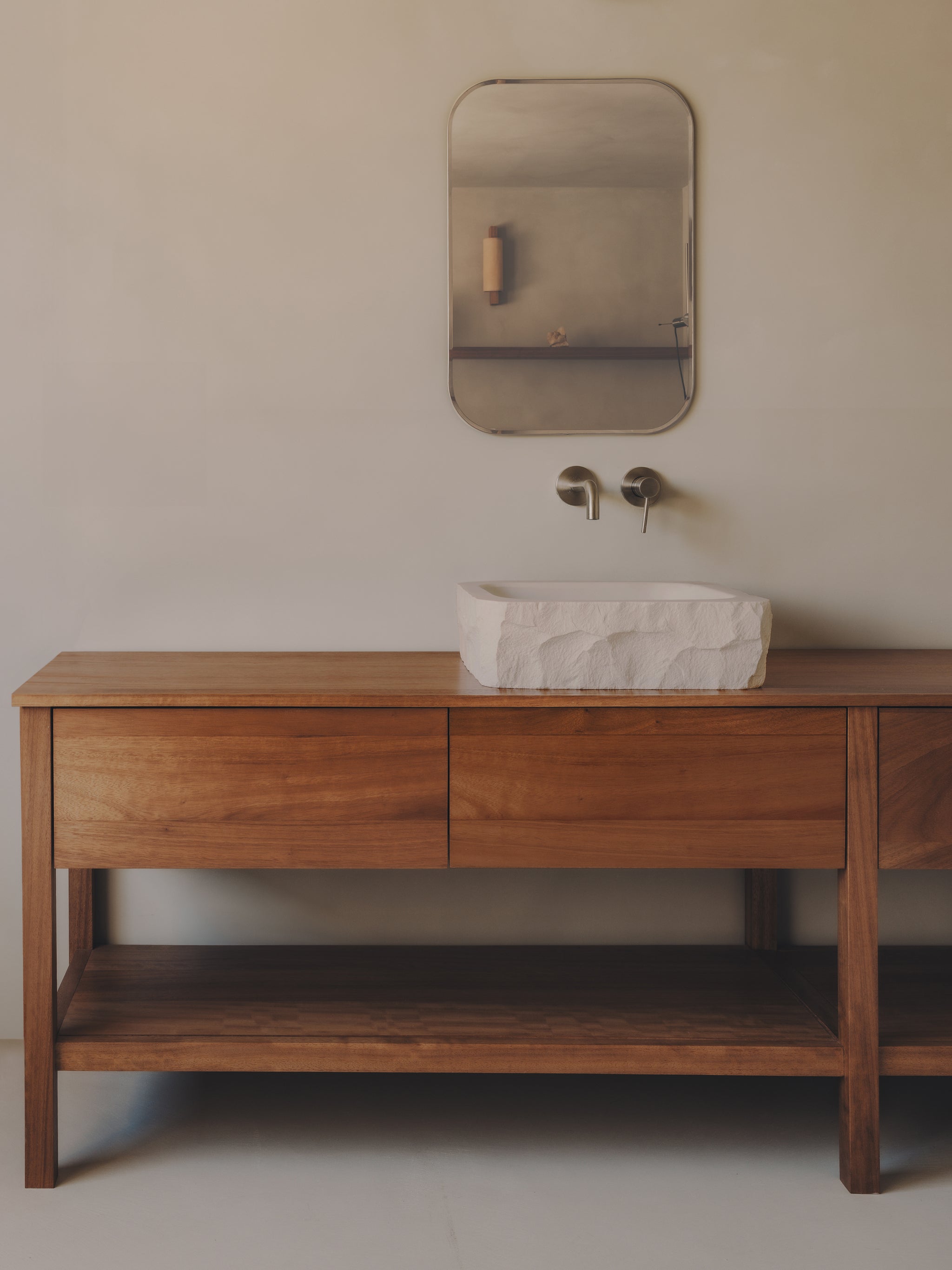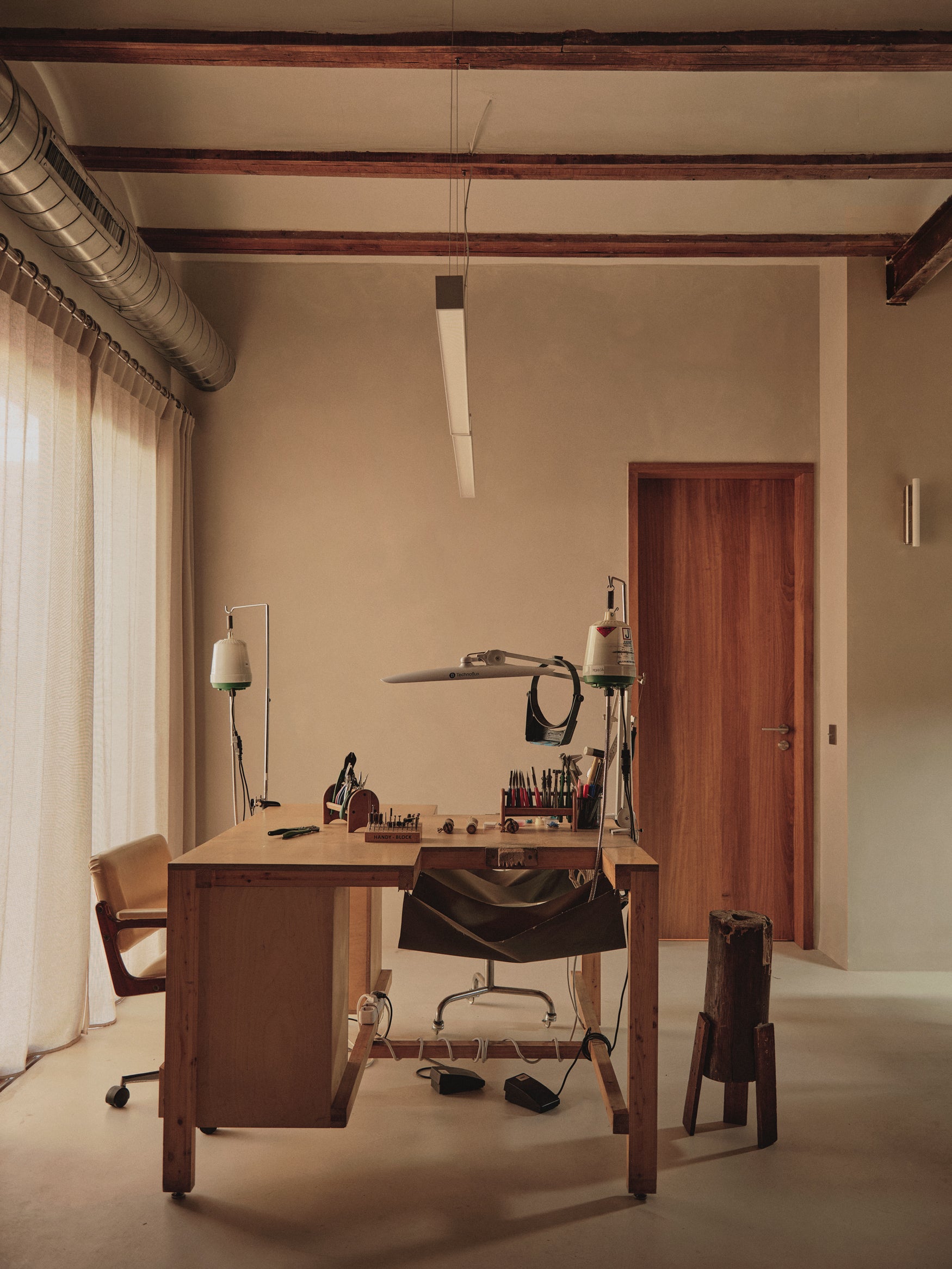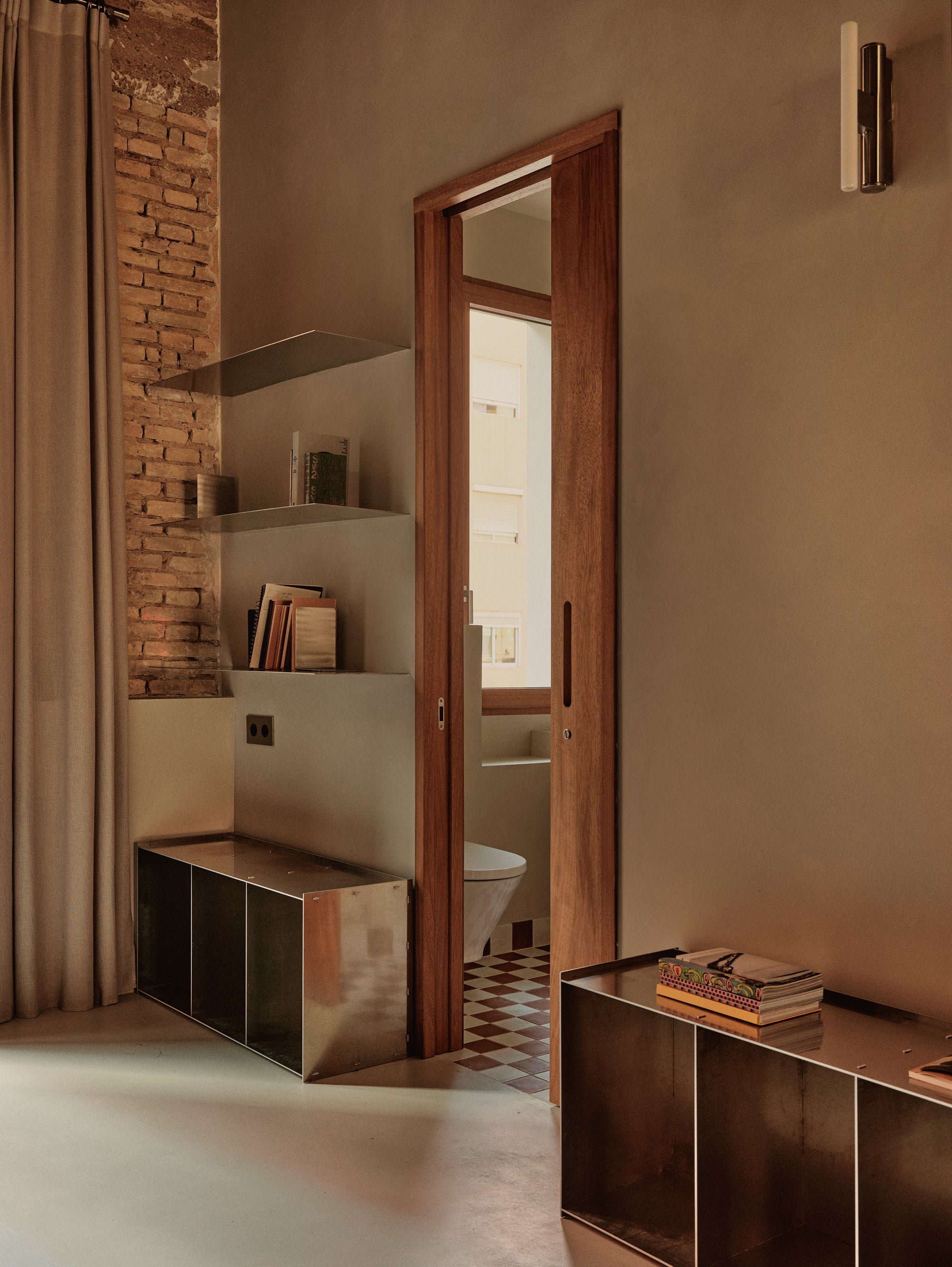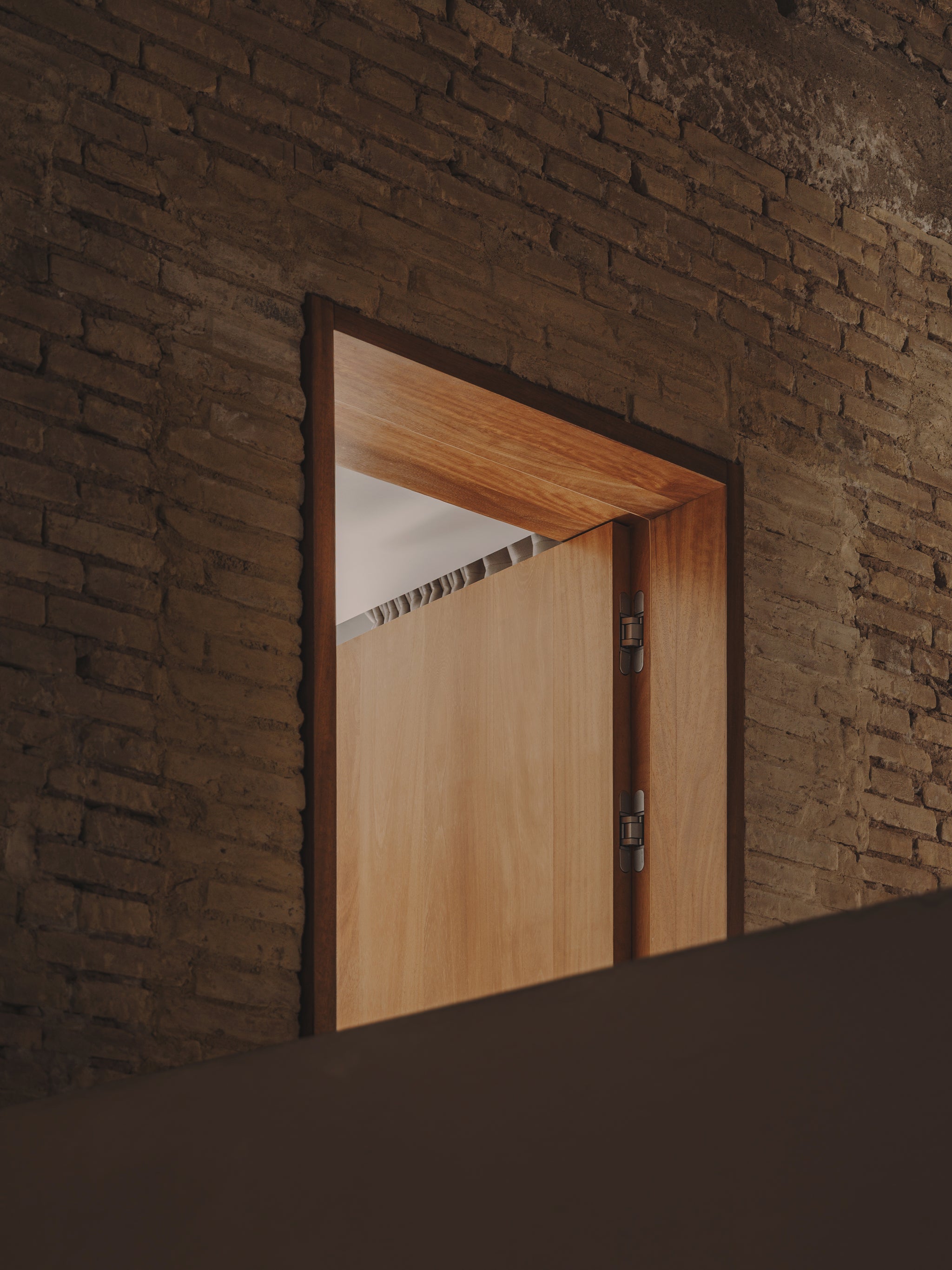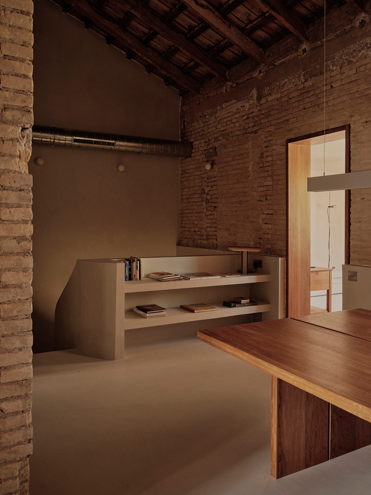 We designed every element of the house as a meeting point between past and present: the kitchen, the custom-made 240 cm high doorways with deep door frames, the storage units, from the workshop to bathrooms. Work tables, were shaped with the same intention, echoing the strength of the structure while introducing the warmth of our collection.