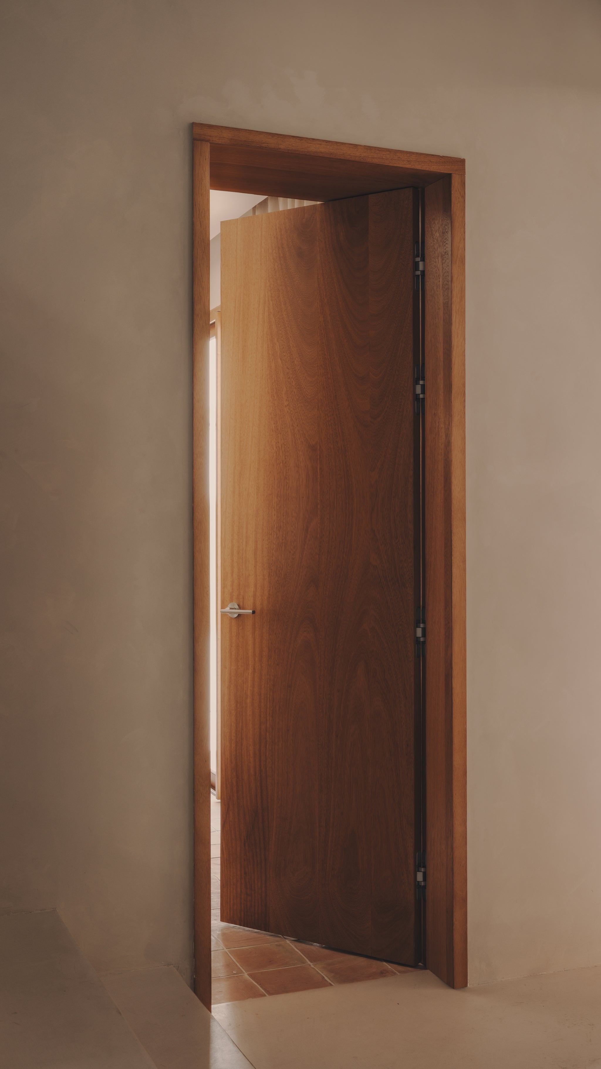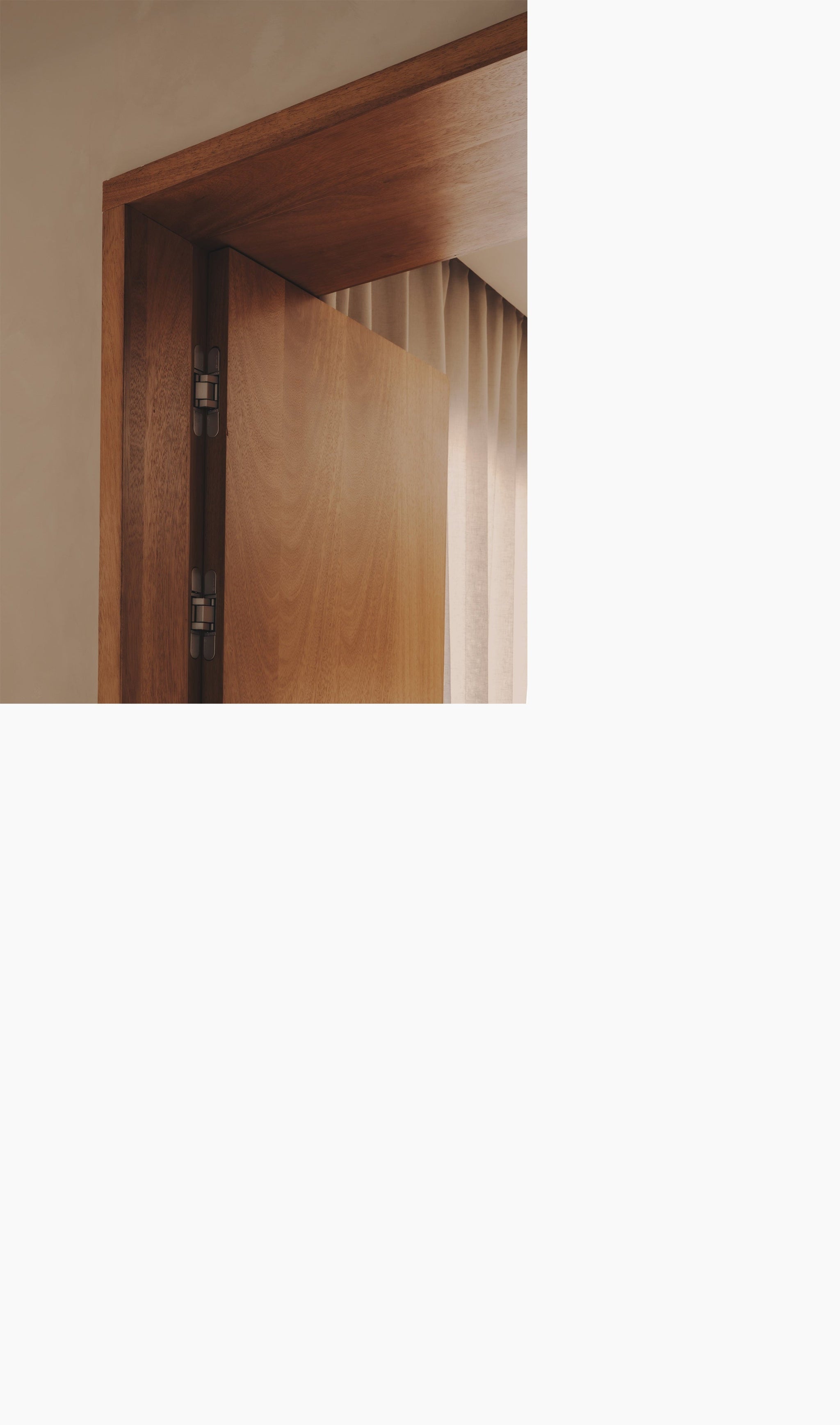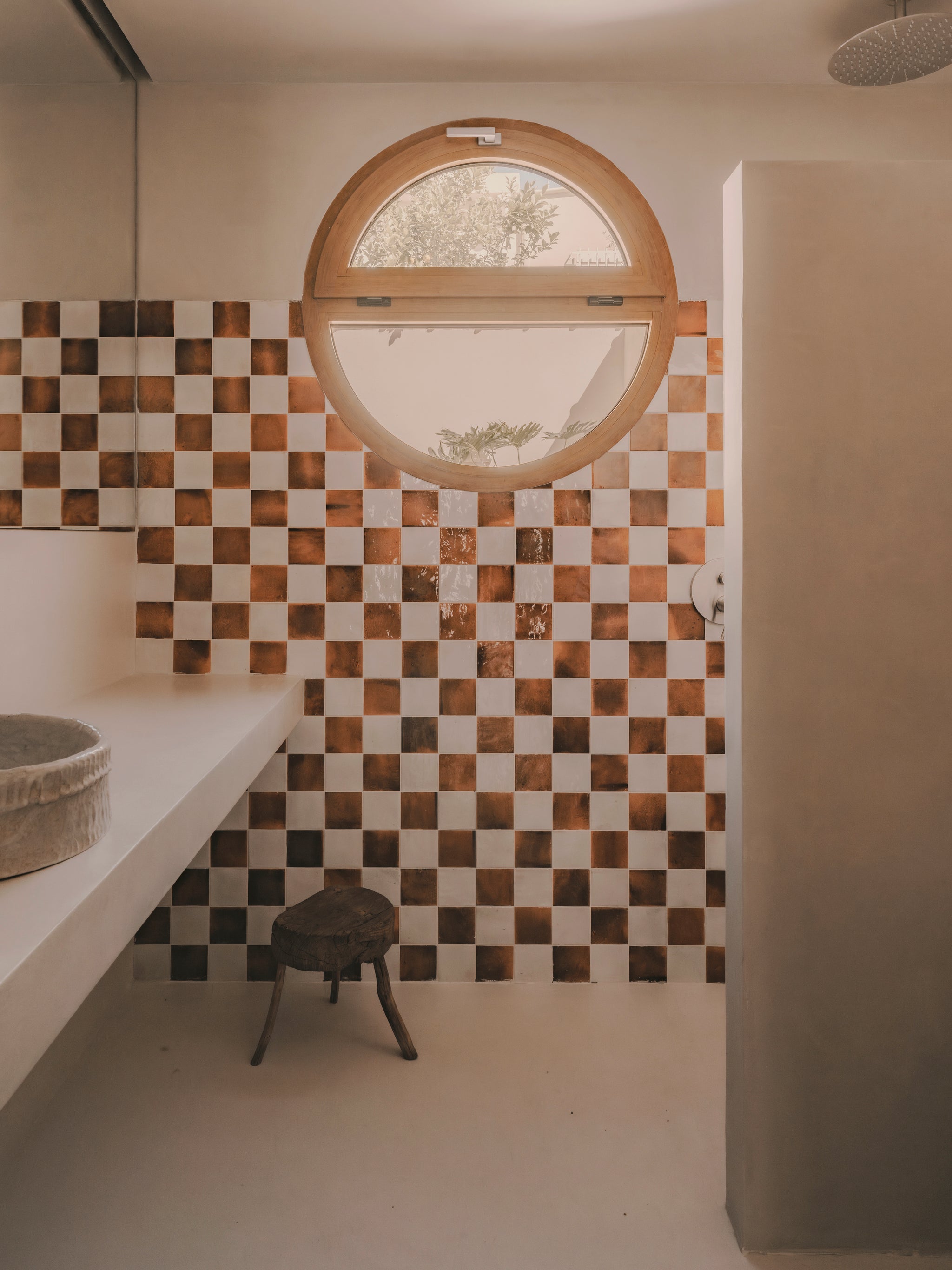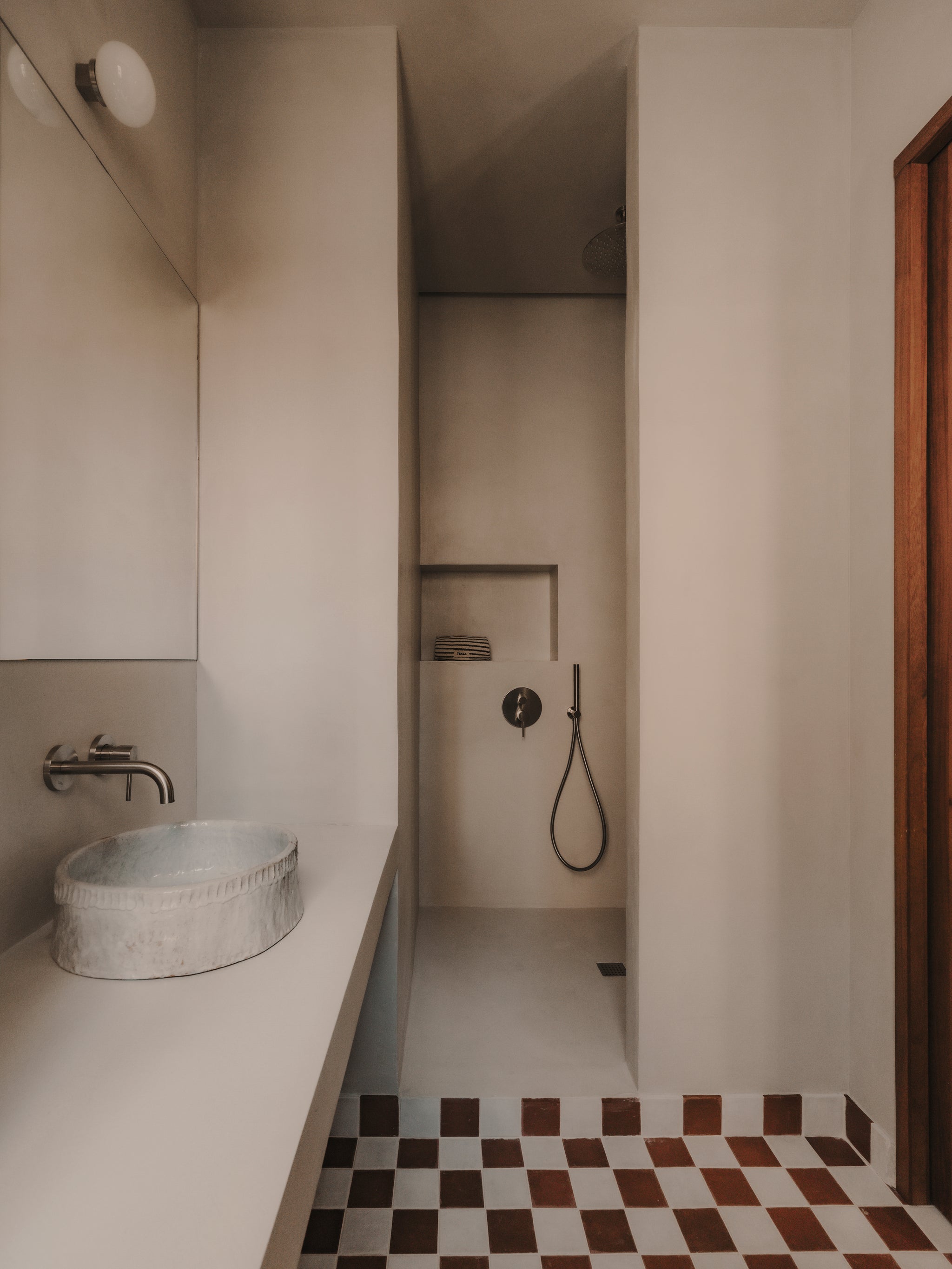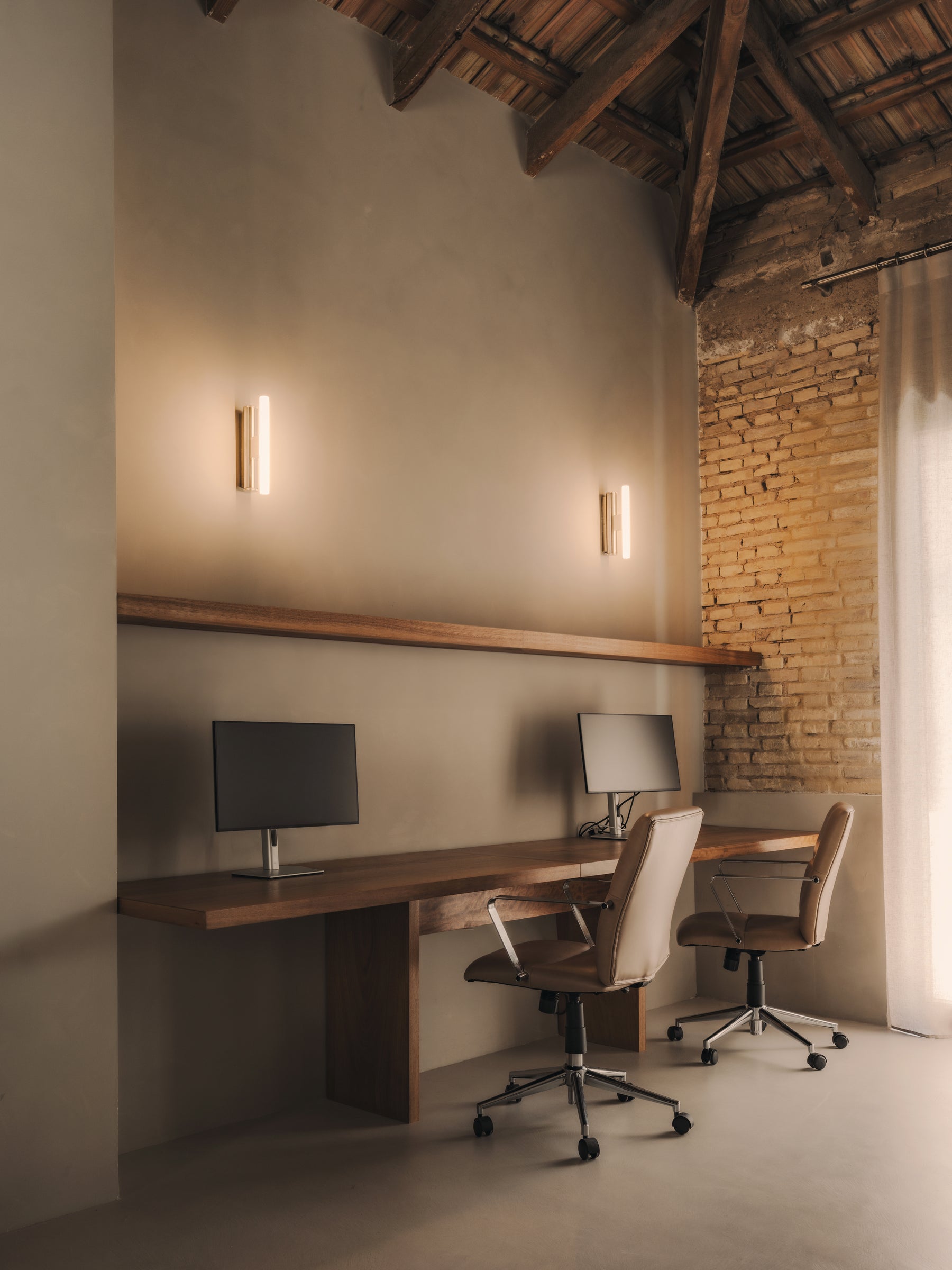 We designed every element of the house as a meeting point between past and present: the kitchen, the custom-made 240 cm high doorways with deep door frames, the storage units, from the workshop to bathrooms. Work tables, were shaped with the same intention, echoing the strength of the structure while introducing the warmth of our collection.